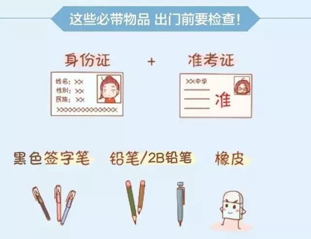 入场携带身份证原件(检查是否过期)、准考证、2B铅笔、黑色签字笔、橡皮、直尺等。除上述物品外,其他物品不准带入考场。《数学》、《高等数学》考试,可使用没有存储记忆功能的计算器。注意看清楚准考证上面标注的考点名称、地址、考场号等重要信息。