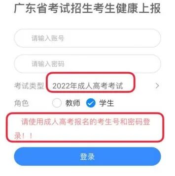 考生须通过广东省教育考试院微信公众号,点击【办事服务—健康上报—2022年成人高考考试】,使用成人高考报名的账号(考生号)和密码登录进行健康申报和赴考受限信息申报。如忘记密码,可登录报名系统(网址:http://www.eeagd.edu.cn/cr)点击【忘记密码】操作找回密码。