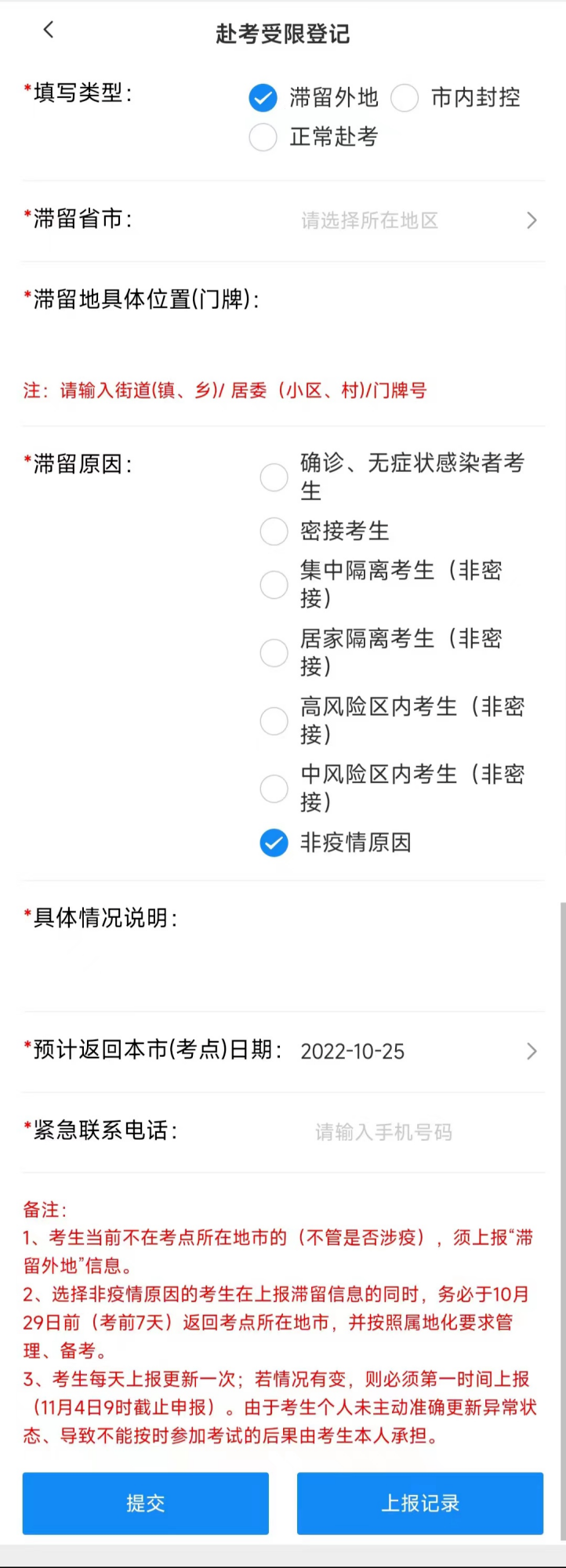 2.非疫情滞留外地考生须在严格遵守防疫要求的前提下,务必于10月29日前(考前7天)返回考点所在地市,顺利返回后及时更新填报“正常赴考”。